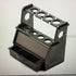 This stand features a twin deck design and a lower pull out drawer with two compartments. The upper deck is used to hold shock bodies and features four 16mm diameter holes that taper to 15mm, making it compatible with a variety of shock types. The upper deck also has six slots that can be used to hold shock shafts. The lower deck features four 14mm holes that taper down to 12mm, and is used to hold shock caps. The lower deck also features an 85mm long scale that can be used to measure the distance between the bottom of the shock body and the top of the shock end, as well as rebound, shock shaft length and more for a precise build. The upright plate has a magnetic strip with a 7mm deep lip that can be used to hold small screws, c-clips and other small steel items.